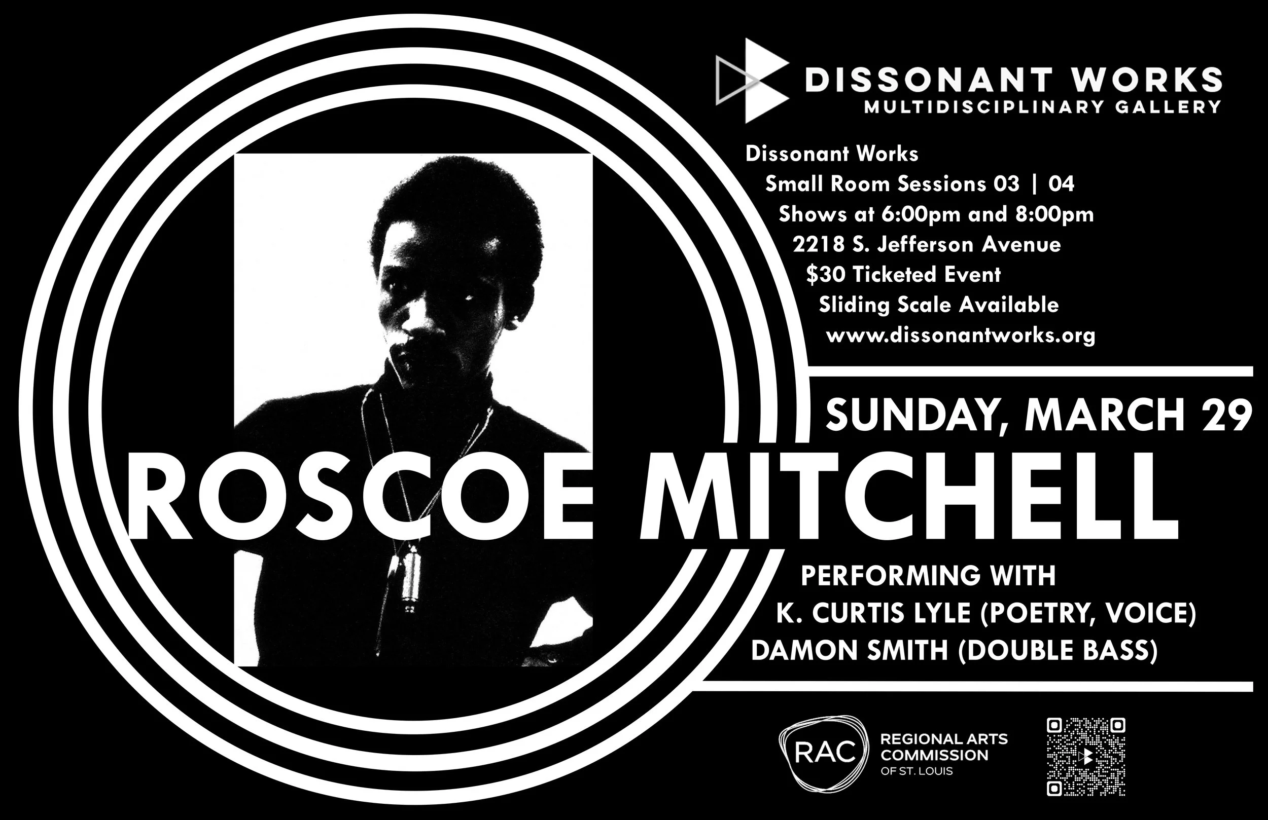 Poster for Roscoe Mitchell with K. Curtis Lyle and Damon Smith at Dissonant Works, March 29.
